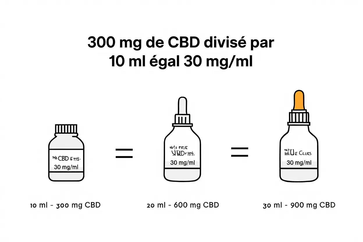 La concentration indique la quantité de CBD par millilitre de e-liquide. Pour l’obtenir, divisez le dosage total par le volume du flacon : par exemple, 300 mg dans 10 ml donne 30 mg/ml.